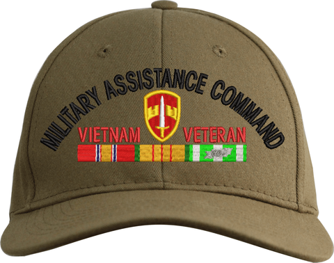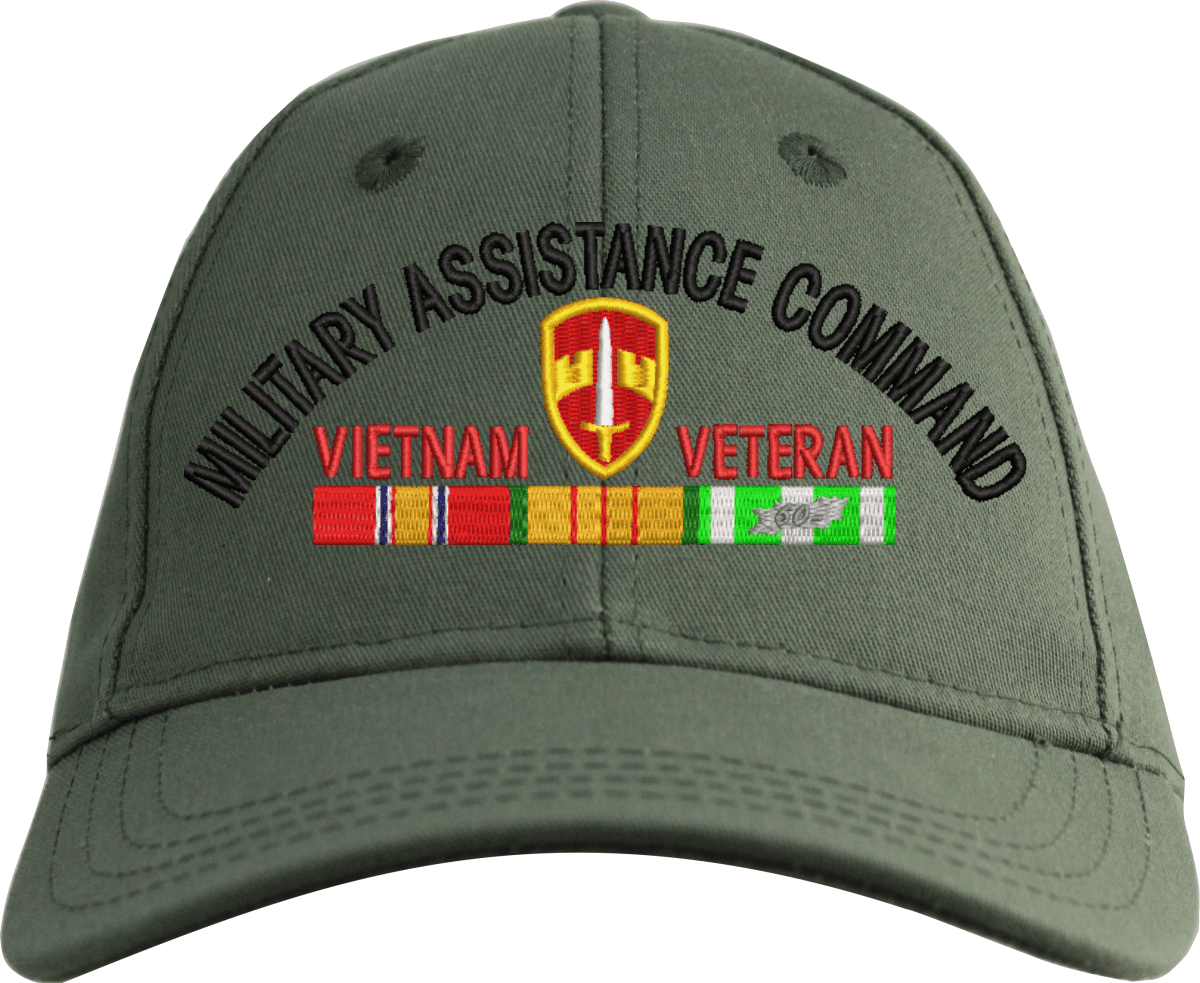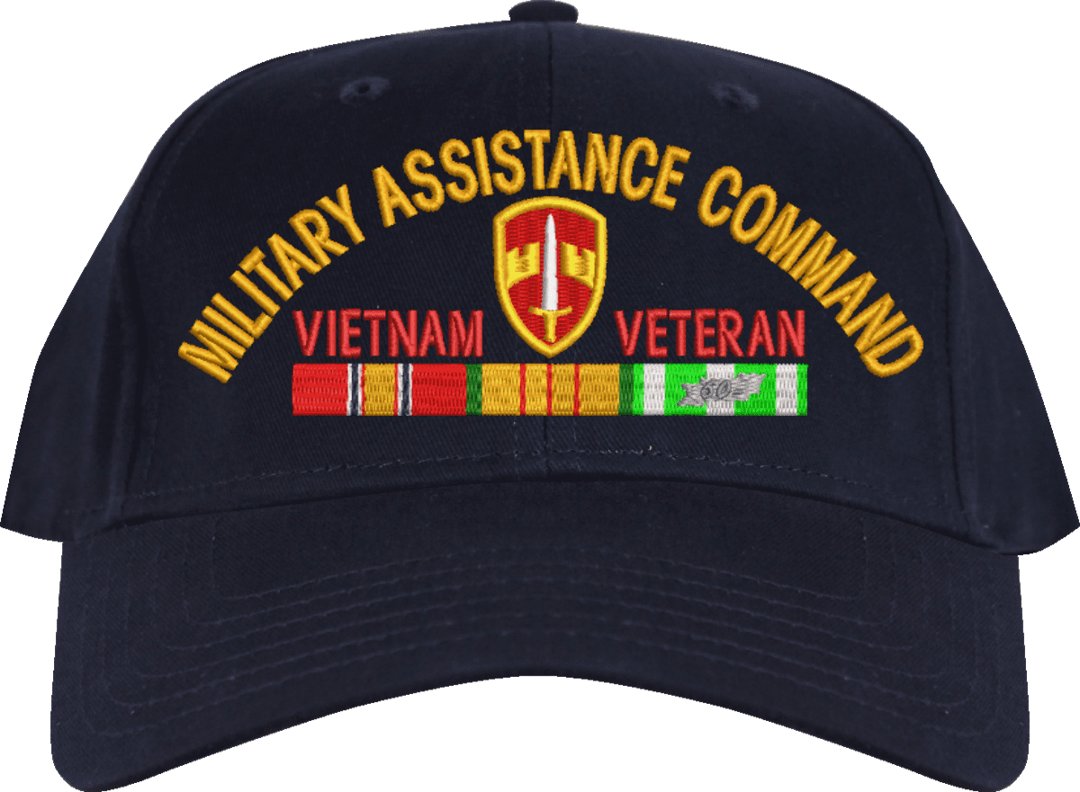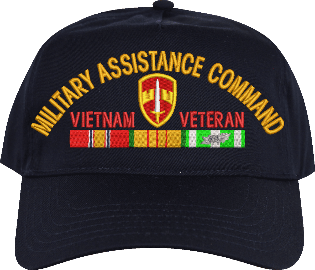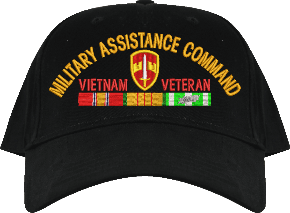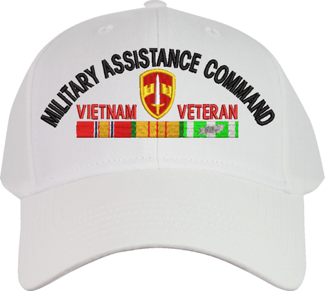 MilitaryBest is proud to offer this Military Assistance Command Vietnam Veteran Embroidered Cap with Ribbons. This cap is available in a 5 panel high profile or 6 panel low profile styling. All our caps are made from top quality materials. This cap would make a wonderful addition to your collection or a great gift! All custom embroidery is done at our facility in Scottsboro, AL.