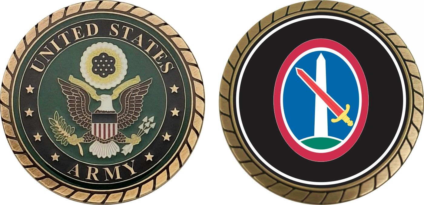 This 1 3/4” Military District of Washington Patch Challenge Coin is proudly offered by Militarybest. This Officially Licensed Army coin has beautiful enamel finish on one side and an organized crisp clean design on the opposite side.