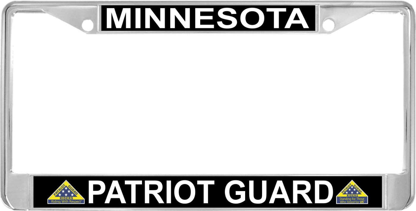This Minnesota Patriot Guard Automobile License Plate Frame is proudly produced at our facility in Scottsboro, Alabama. Each Chrome Dipped Alloy Frame has Poly Coated Aluminum Inserts which allow our production team to provide you with High Quality Designs. Unfortunately, this frame is not offered as a Motorcycle Frame.Please check with your state and local regulations regarding suitability for displaying this Automobile License Plate Frame on your vehicle since these regulations may have changed in your state. Various weather and road conditions may impact the life span of your frame e.g. salted roads, long exposure to direct sunlight etc.