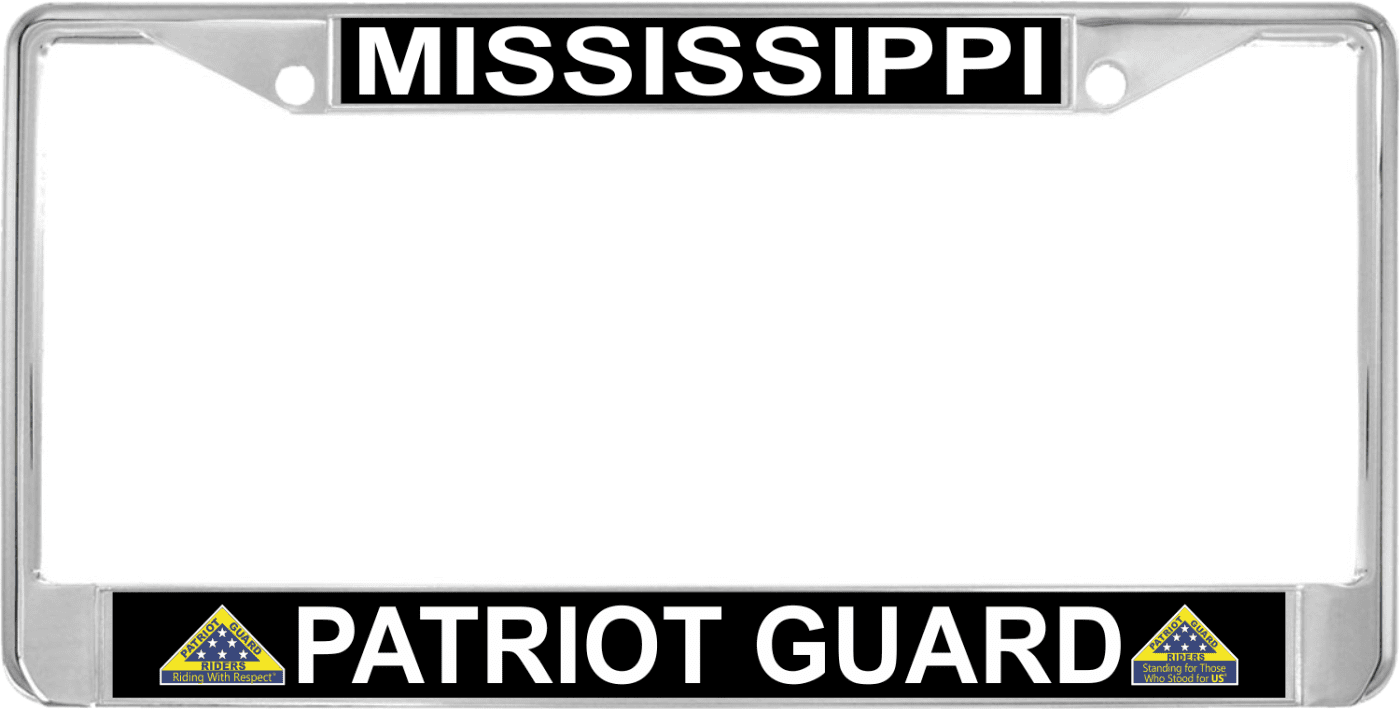 This Mississippi Patriot Guard Automobile License Plate Frame is proudly produced at our facility in Scottsboro, Alabama. Each Chrome Dipped Alloy Frame has Poly Coated Aluminum Inserts which allow our production team to provide you with High Quality Designs. Unfortunately, this frame is not offered as a Motorcycle Frame.Please check with your state and local regulations regarding suitability for displaying this Automobile License Plate Frame on your vehicle since these regulations may have changed in your state. Various weather and road conditions may impact the life span of your frame e.g. salted roads, long exposure to direct sunlight etc.