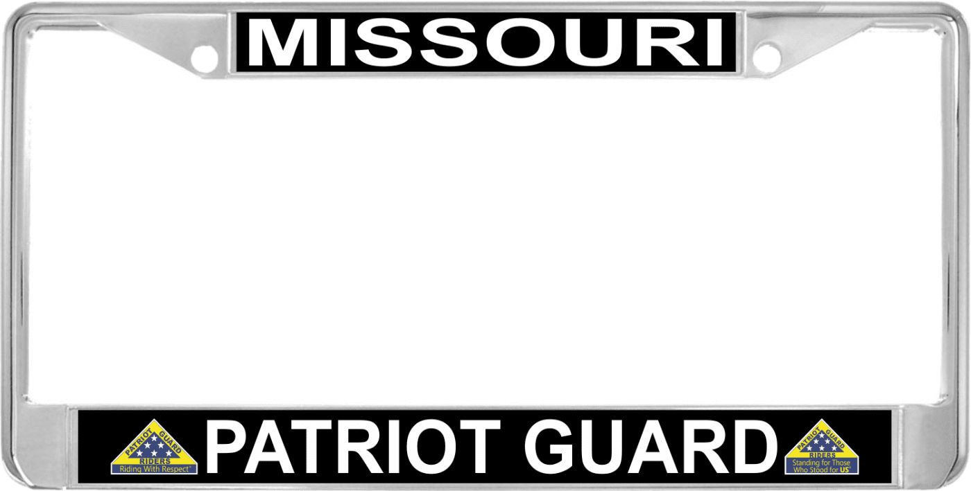 This Missouri Patriot Guard Automobile License Plate Frame is proudly produced at our facility in Scottsboro, Alabama. Each Chrome Dipped Alloy Frame has Poly Coated Aluminum Inserts which allow our production team to provide you with High Quality Designs. Unfortunately, this frame is not offered as a Motorcycle Frame.Please check with your state and local regulations regarding suitability for displaying this Automobile License Plate Frame on your vehicle since these regulations may have changed in your state. Various weather and road conditions may impact the life span of your frame e.g. salted roads, long exposure to direct sunlight etc.