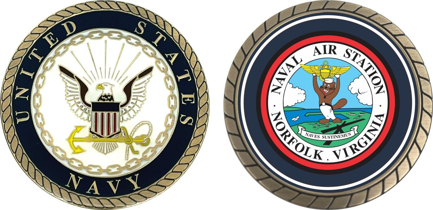 This 1 3/4” Naval Air Station Norfolk, Virginia Challenge Coin is proudly offered by Militarybest. This Officially Licensed Navy coin has beautiful enamel finish on one side and an organized crisp clean design on the opposite side.