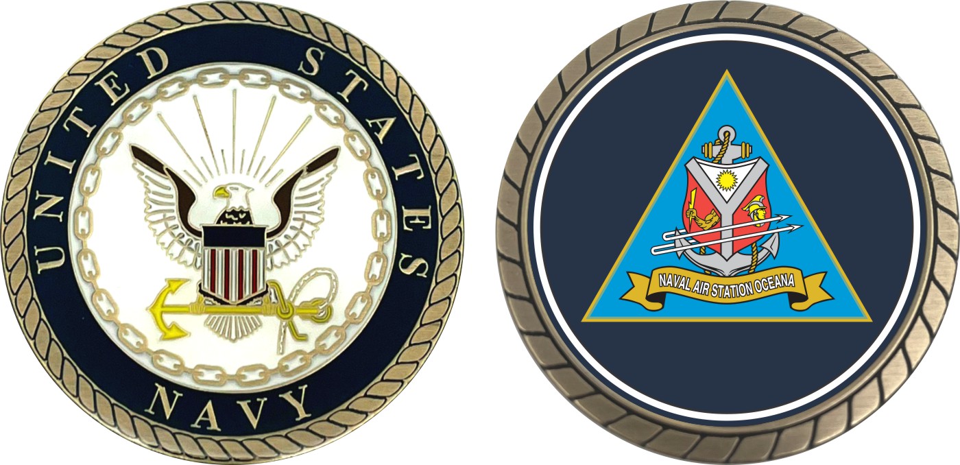 This 1 3/4” Naval Air Station Oceana Challenge Coin is proudly offered by Militarybest. This Officially Licensed Navy coin has beautiful enamel finish on one side and an organized crisp clean design on the opposite side.