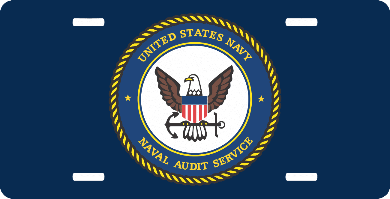 This Naval Audit Service License Plate is made from heavy gauge aluminum and has a baked enamel finish to last for many years of use. Each plate measures 5 15/16" x 11 15/16". This license plate would make a wonderful addition to your collection or a great gift.