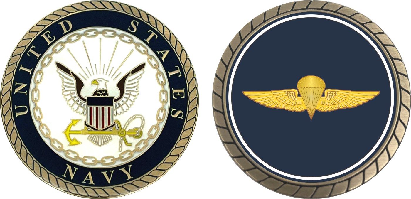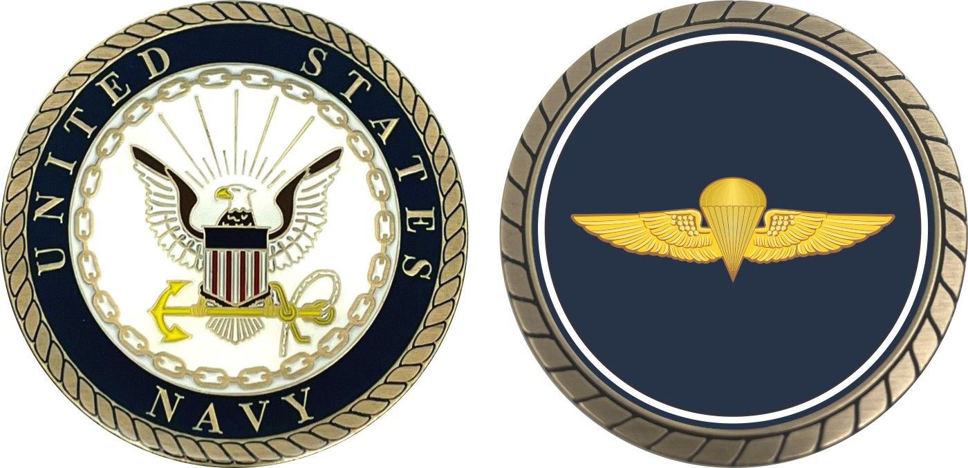 This 1 3/4 Naval Parachutist Challenge Coin is proudly offered by Militarybest. This Officially Licensed Navy coin has beautiful enamel finish on one side and an organized crisp clean design on the opposite side.