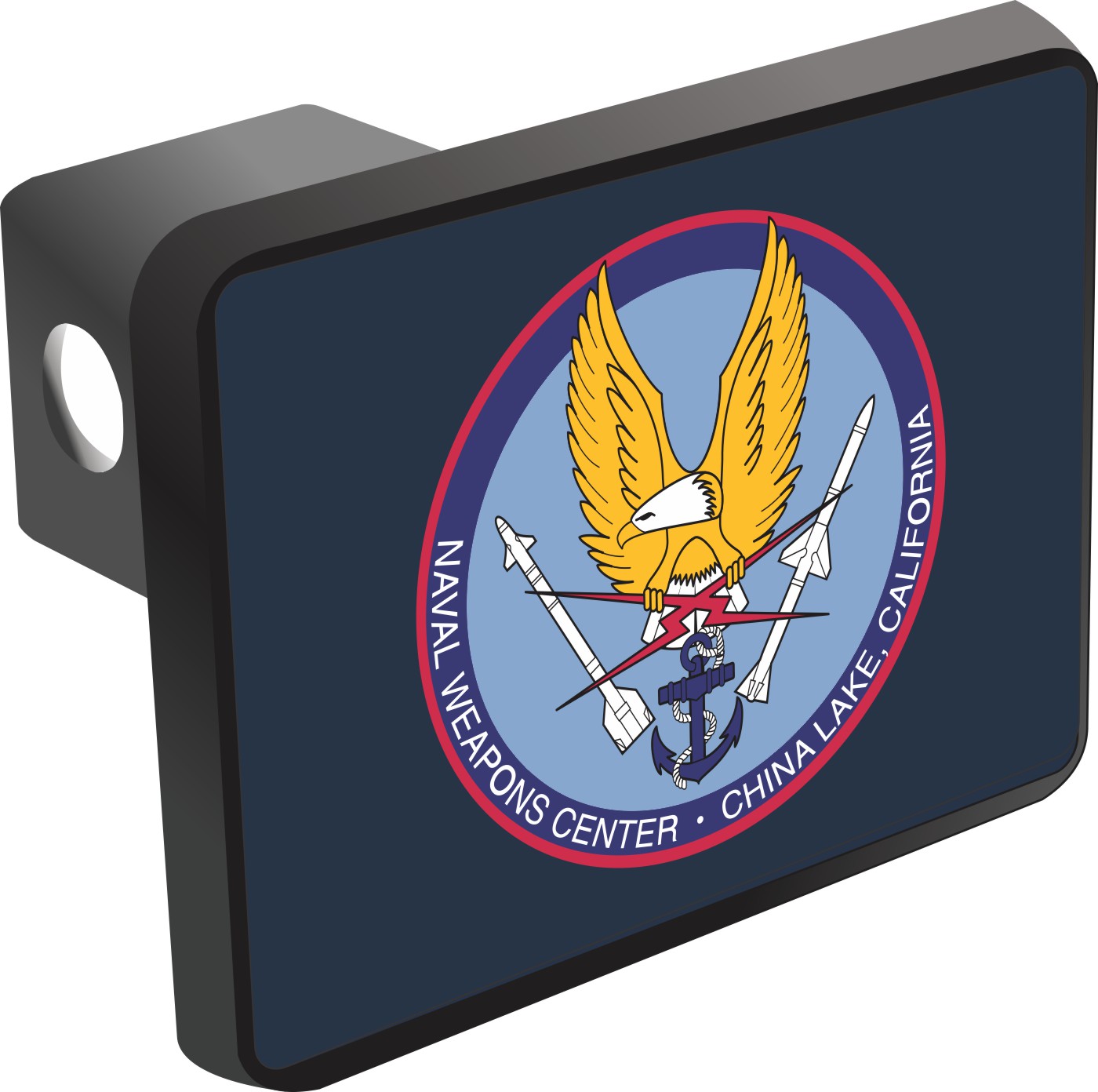 This Naval Weapons Center China Lake, California Hitch Cover is proudly Made in the USA. Each Hitch Cover's face plate measures 4.7" x 3.4" and is applied on a black heavy duty injection molded plastic 2" hitch cover; link pin not included. The face plate of the hitch cover is sublimation printed to provide a beautiful glossy finish sure to catch the eye. This hitch cover would make a wonderful addition to your truck or other vehicle.A percentage of the sale of each MilitaryBest item is forwarded to the licensing departments of each respective branch of service in support of the MWR (Morale, Welfare, & Recreation) program. These payments are made by either ALL4U LLC or the wholesaler from where the item originated. Our team thanks you for your service and your support of these programs.