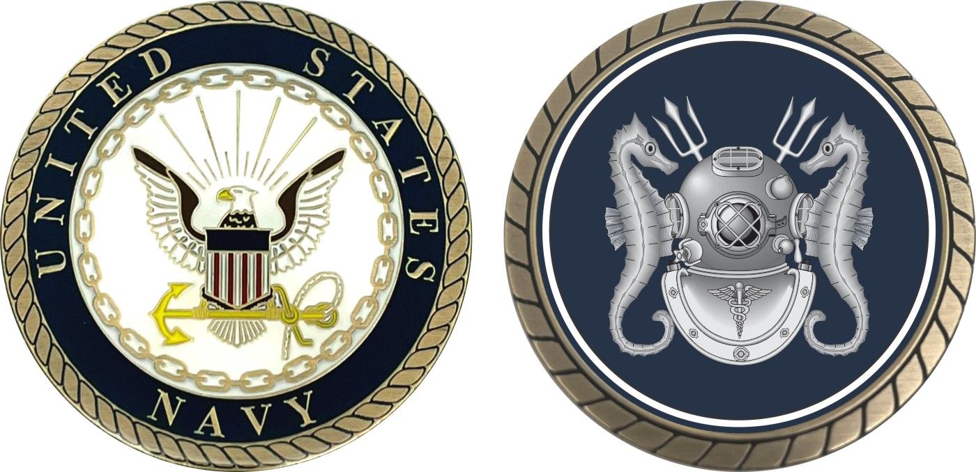 This 1 3/4” Navy Diving Medical Technician Challenge Coin is proudly offered by Militarybest. This Officially Licensed Navy coin has beautiful enamel finish on one side and an organized crisp clean design on the opposite side.