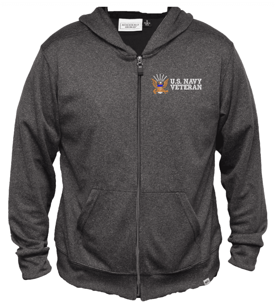 MilitaryBest proudly offers this top-quality U.S. Navy Veteran Men's 100% Polyester Heather Grey Full-Zip Hoodie. We have proudly partnered with Authentically American to offer you this Made in the USA Hoodie. Water & wrinkle resistance make this zip hoodie the perfect layering piece from the golf course to you favorite travel destination.