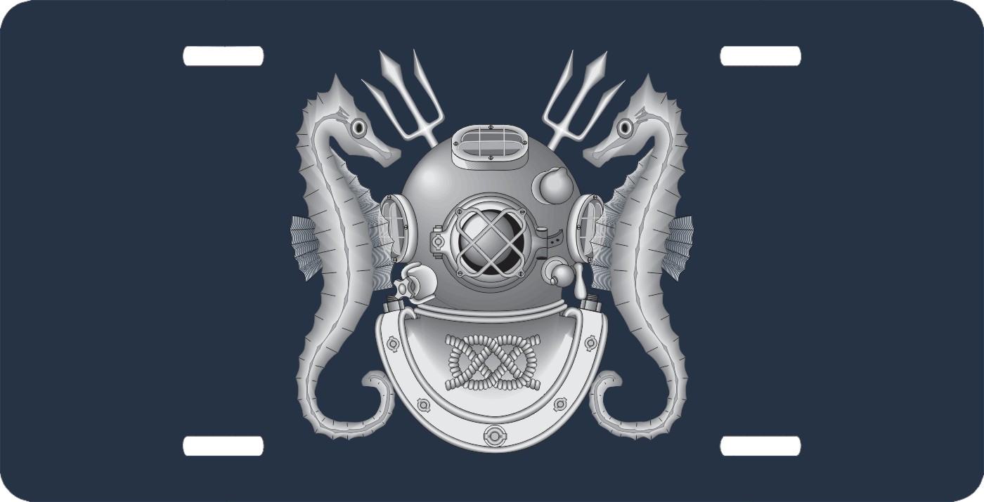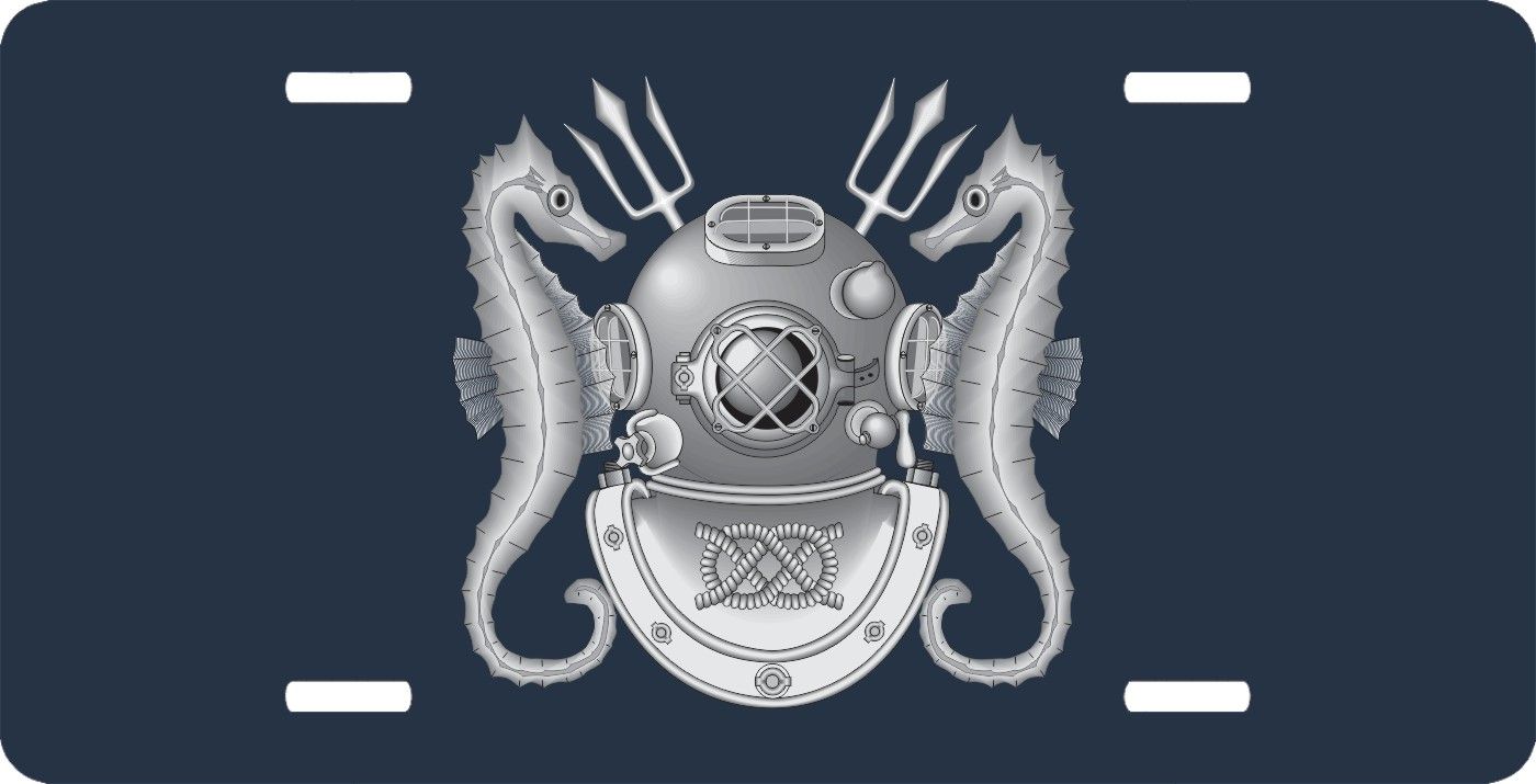 This Navy Master Diver License Plate is made from heavy gauge aluminum and has a baked enamel finish to last for many years of use. Each plate measures 5 15/16" x 11 15/16". This license plate would make a wonderful addition to your collection or a great gift.