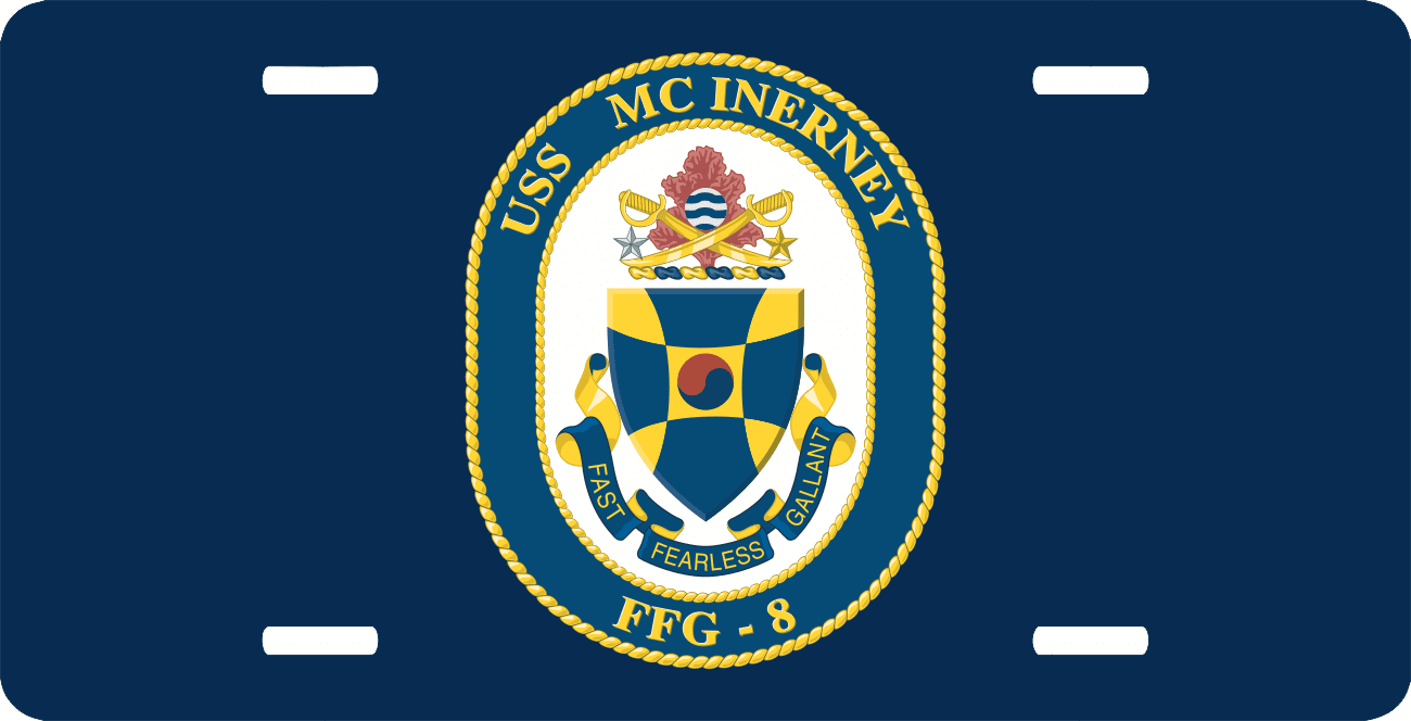 This Navy McInerney FFG-8 License Plate is made from heavy gauge aluminum and has a baked enamel finish to last for many years of use. Each plate measures 5 15/16" x 11 15/16". This license plate would make a wonderful addition to your collection or a great gift.