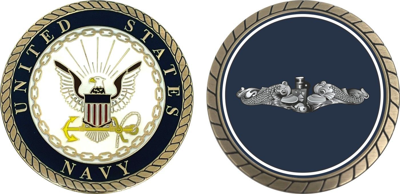 This 1 3/4” Navy Submarine Silver Dolphins Insignia Challenge Coin is proudly offered by Militarybest. This Officially Licensed Navy coin has beautiful enamel finish on one side and an organized crisp clean design on the opposite side.