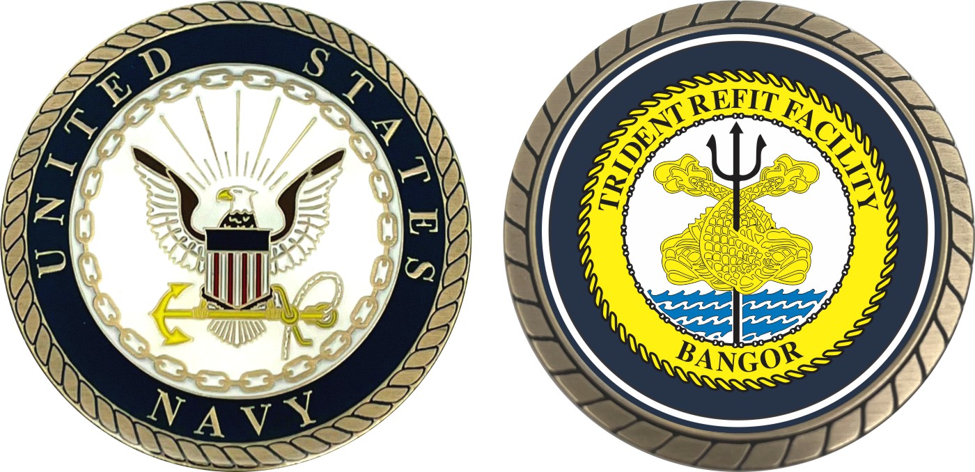 This 1 3/4” Navy Trident Refit Facility Challenge Coin is proudly offered by Militarybest. This Officially Licensed Navy coin has beautiful enamel finish on one side and an organized crisp clean design on the opposite side.