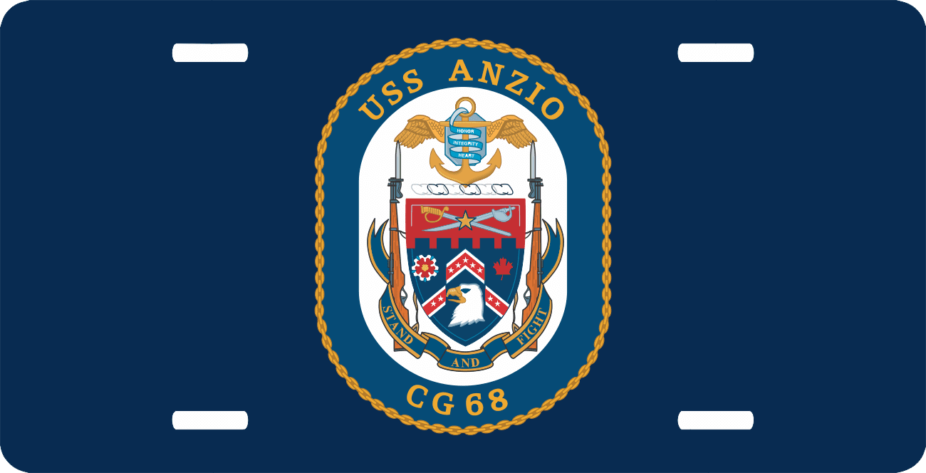 This Navy USS Anzio CG-68 License Plate is made from heavy gauge aluminum and has a baked enamel finish to last for many years of use. Each plate measures 5 15/16" x 11 15/16". This license plate would make a wonderful addition to your collection or a great gift.