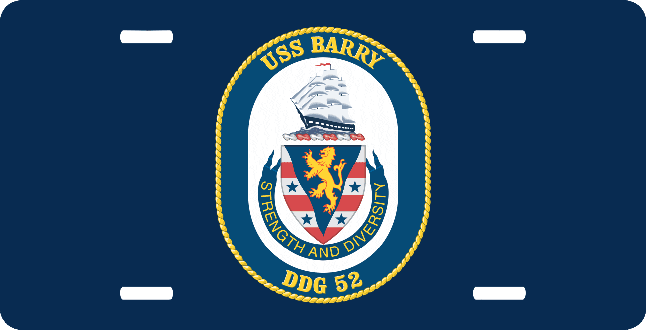 This Navy USS Barry DDG-52 License Plate is made from heavy gauge aluminum and has a baked enamel finish to last for many years of use. Each plate measures 5 15/16" x 11 15/16". This license plate would make a wonderful addition to your collection or a great gift.
