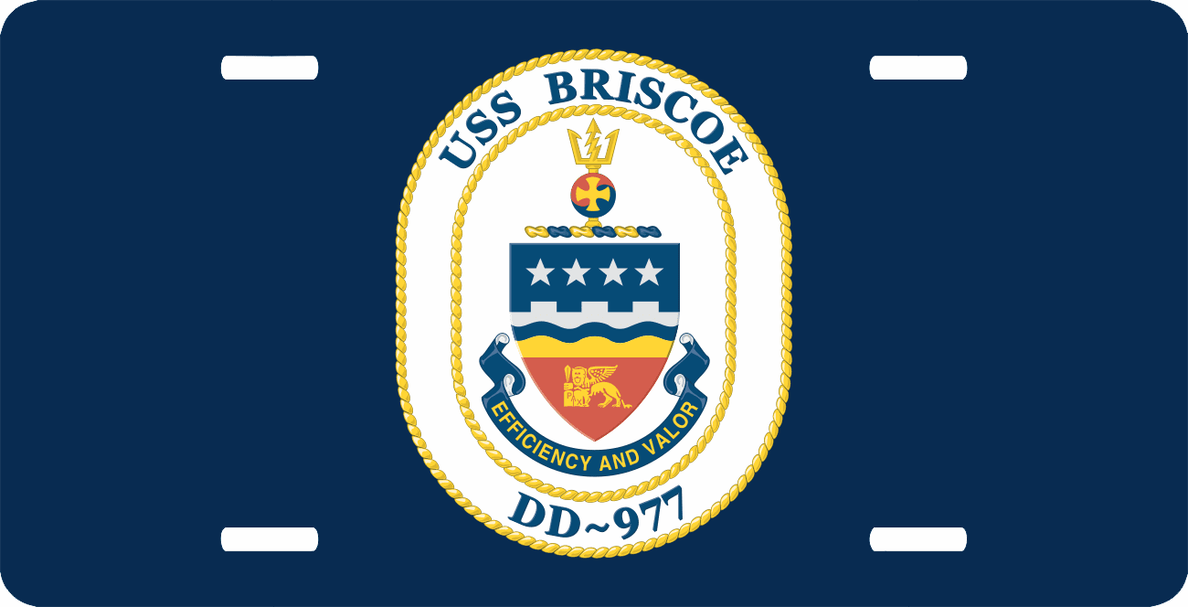 This Navy USS Briscoe DD-977 License Plate is made from heavy gauge aluminum and has a baked enamel finish to last for many years of use. Each plate measures 5 15/16" x 11 15/16". This license plate would make a wonderful addition to your collection or a great gift.