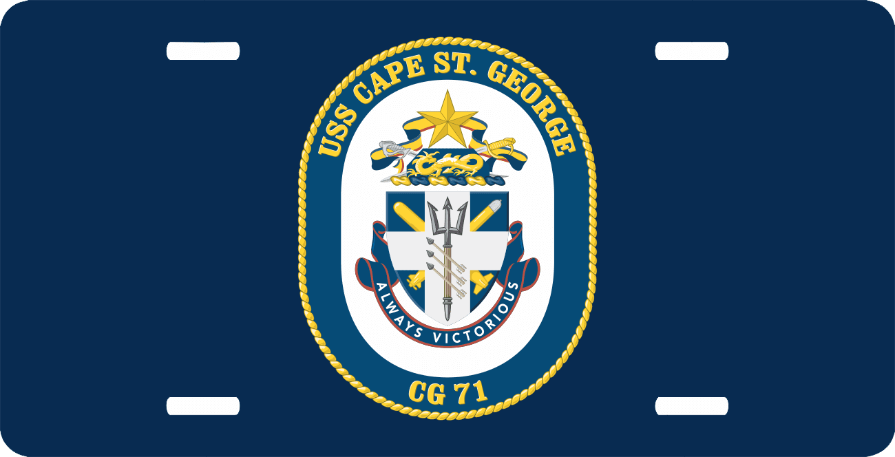 This Navy USS Cape St License Plate is made from heavy gauge aluminum and has a baked enamel finish to last for many years of use. Each plate measures 5 15/16" x 11 15/16". This license plate would make a wonderful addition to your collection or a great gift.