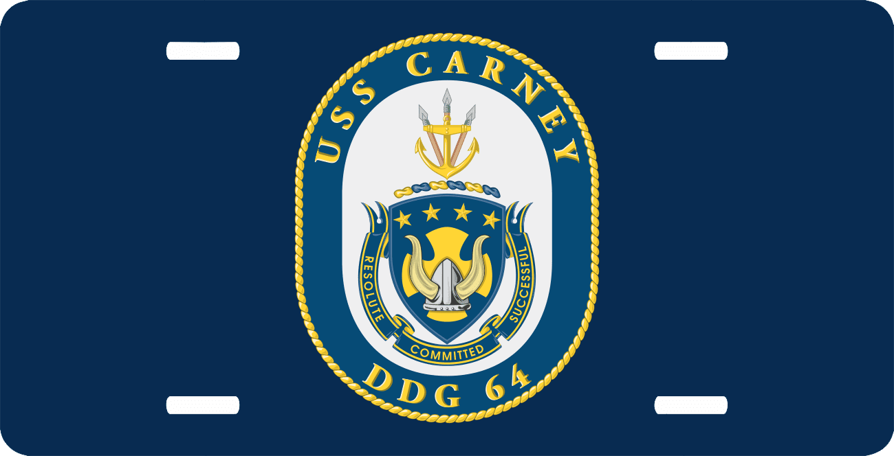 This Navy USS Carney DDG-64 License Plate is made from heavy gauge aluminum and has a baked enamel finish to last for many years of use. Each plate measures 5 15/16" x 11 15/16". This license plate would make a wonderful addition to your collection or a great gift.