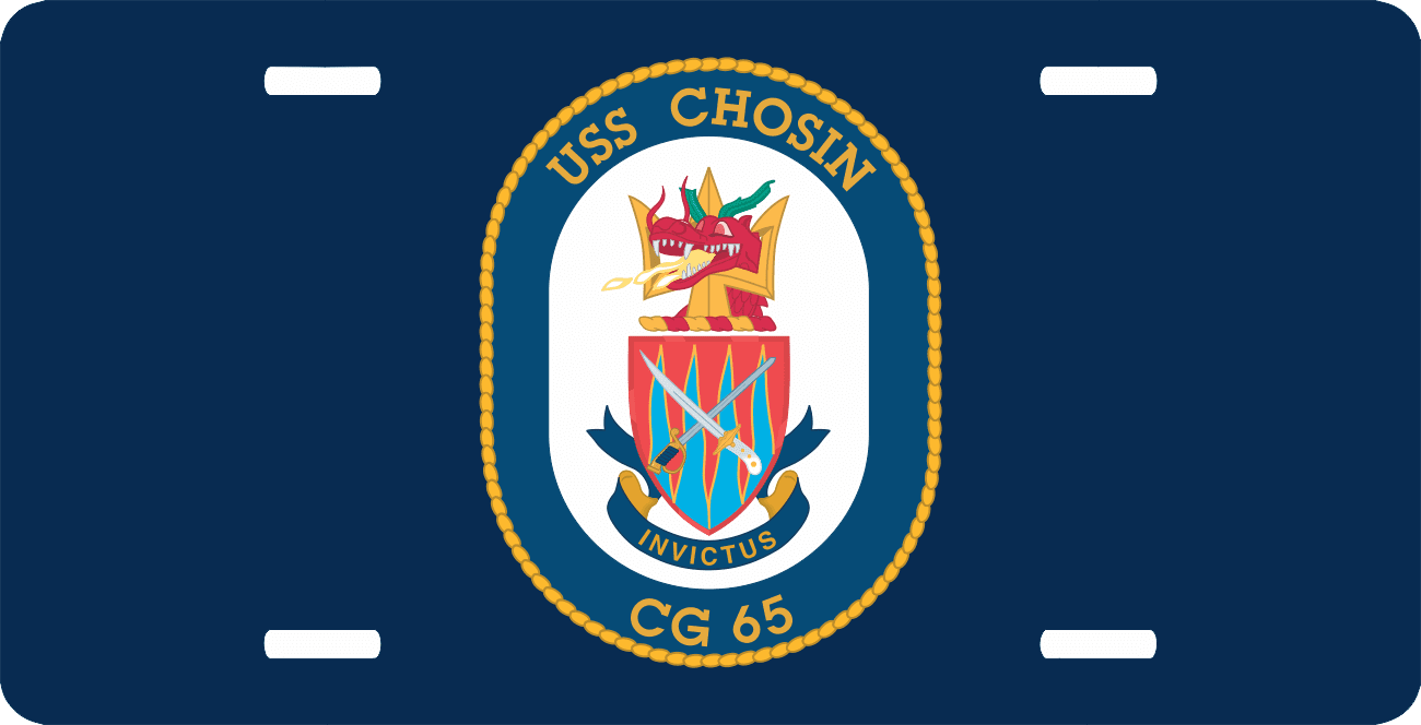 This Navy USS Chosin CG-65 License Plate is made from heavy gauge aluminum and has a baked enamel finish to last for many years of use. Each plate measures 5 15/16" x 11 15/16". This license plate would make a wonderful addition to your collection or a great gift.