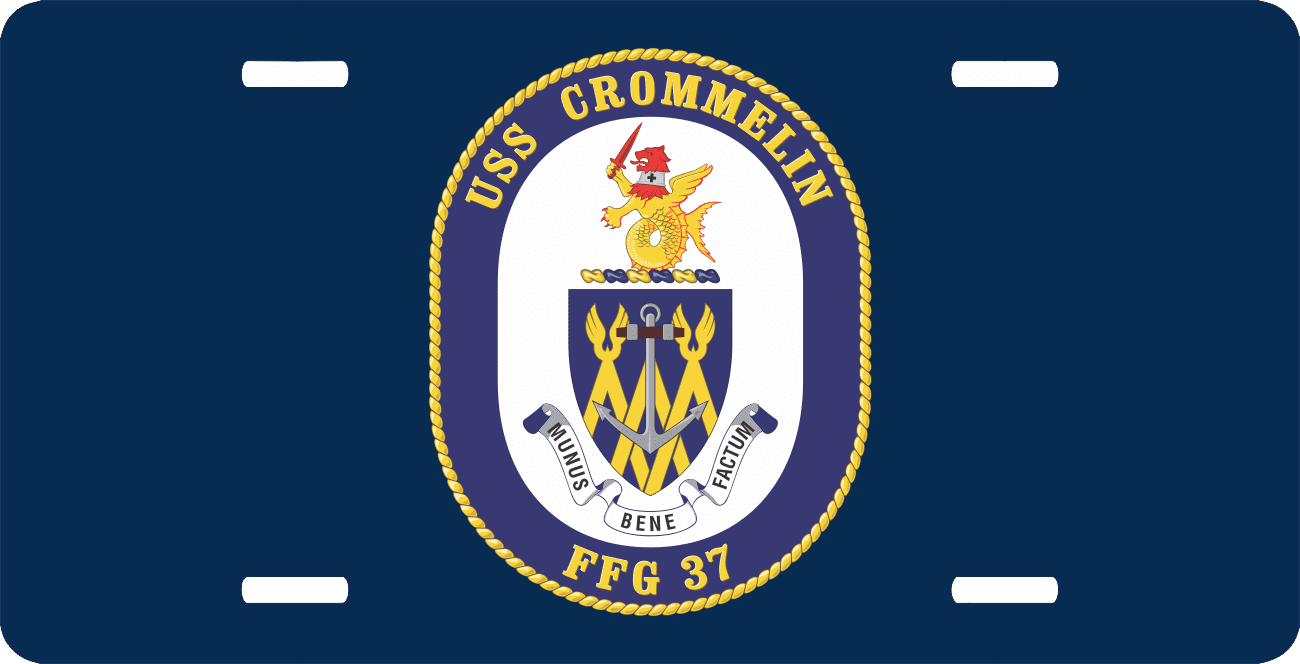This Navy USS Crommelin FFG-37 License Plate is made from heavy gauge aluminum and has a baked enamel finish to last for many years of use. Each plate measures 5 15/16" x 11 15/16". This license plate would make a wonderful addition to your collection or a great gift.