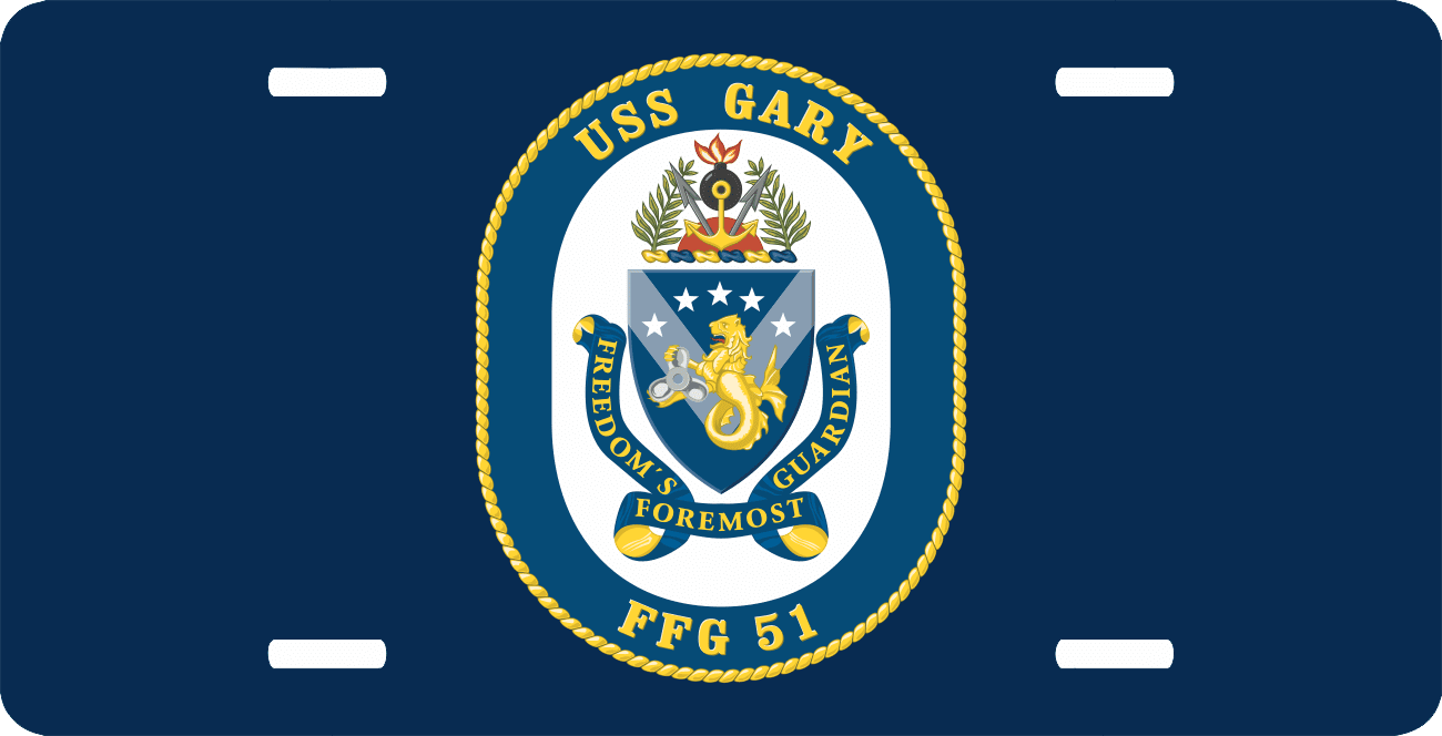 This Navy USS Gary FFG-51 License Plate is made from heavy gauge aluminum and has a baked enamel finish to last for many years of use. Each plate measures 5 15/16" x 11 15/16". This license plate would make a wonderful addition to your collection or a great gift.
