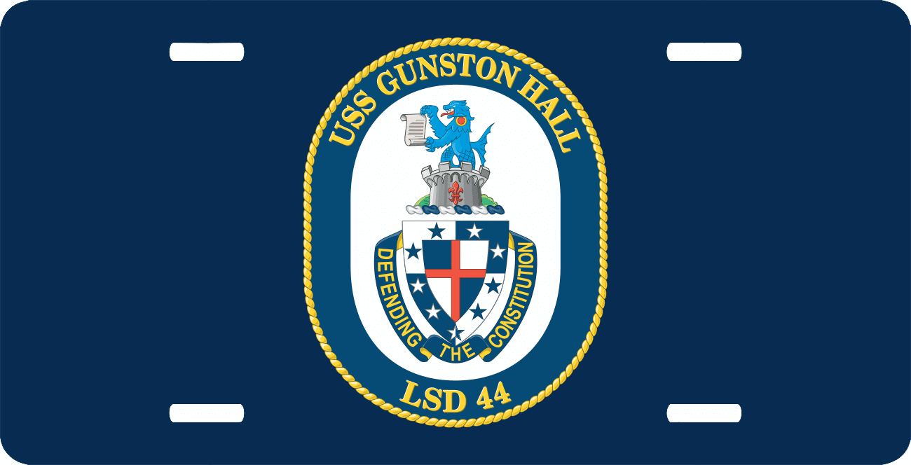This Navy USS Gunston Hall LSD-44 License Plate is made from heavy gauge aluminum and has a baked enamel finish to last for many years of use. Each plate measures 5 15/16" x 11 15/16". This license plate would make a wonderful addition to your collection or a great gift.