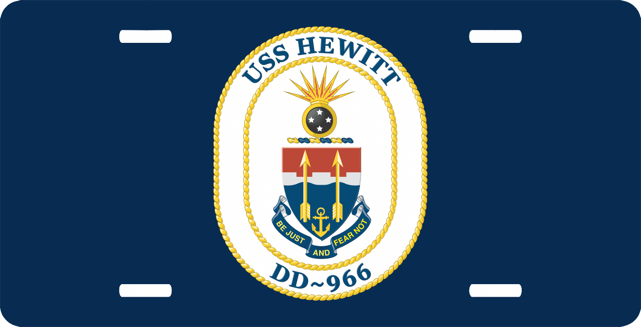 This Navy USS Hewitt DD-966 License Plate is made from heavy gauge aluminum and has a baked enamel finish to last for many years of use. Each plate measures 5 15/16" x 11 15/16". This license plate would make a wonderful addition to your collection or a great gift.
