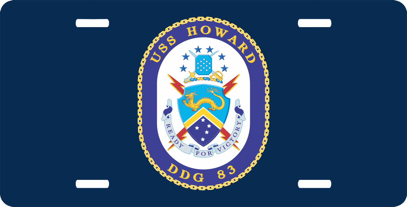 This Navy USS Howard DDG-83 License Plate is made from heavy gauge aluminum and has a baked enamel finish to last for many years of use. Each plate measures 5 15/16" x 11 15/16". This license plate would make a wonderful addition to your collection or a great gift.