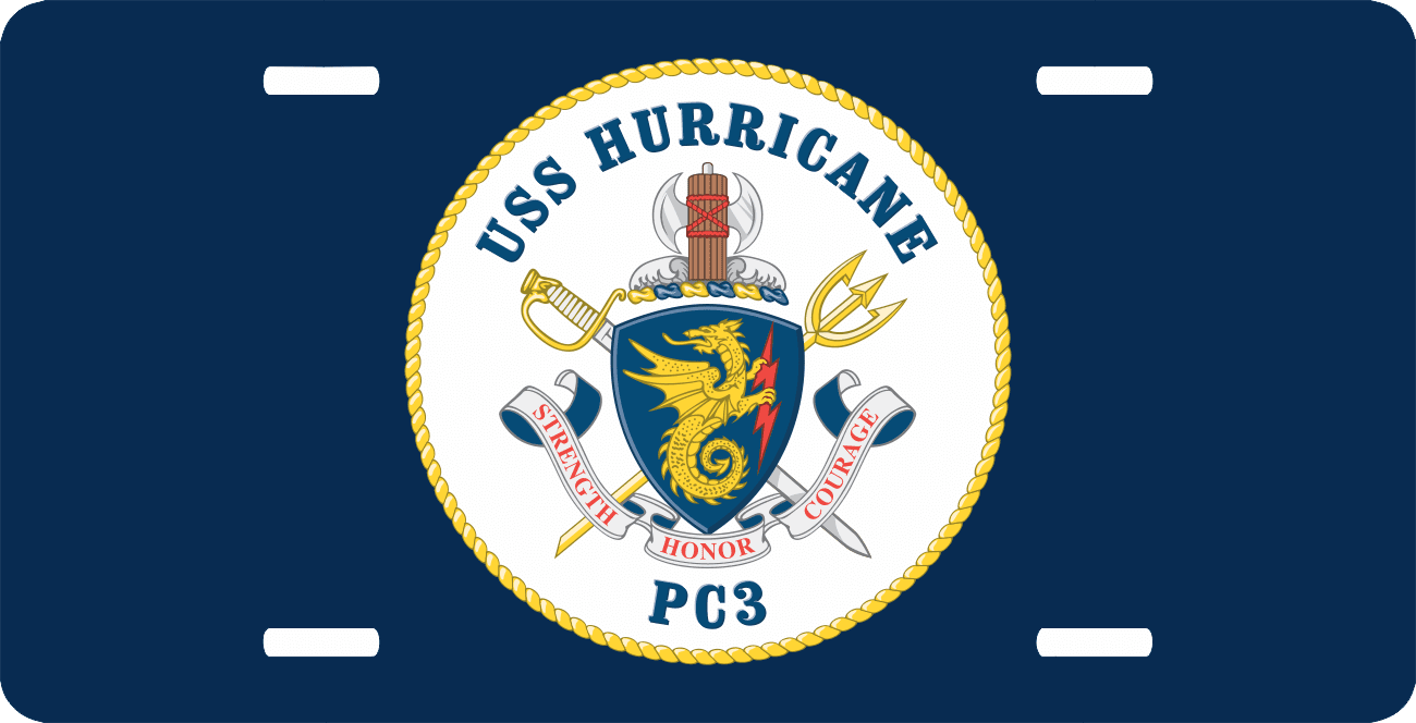 This Navy USS Hurricane PC-3 License Plate is made from heavy gauge aluminum and has a baked enamel finish to last for many years of use. Each plate measures 5 15/16" x 11 15/16". This license plate would make a wonderful addition to your collection or a great gift.