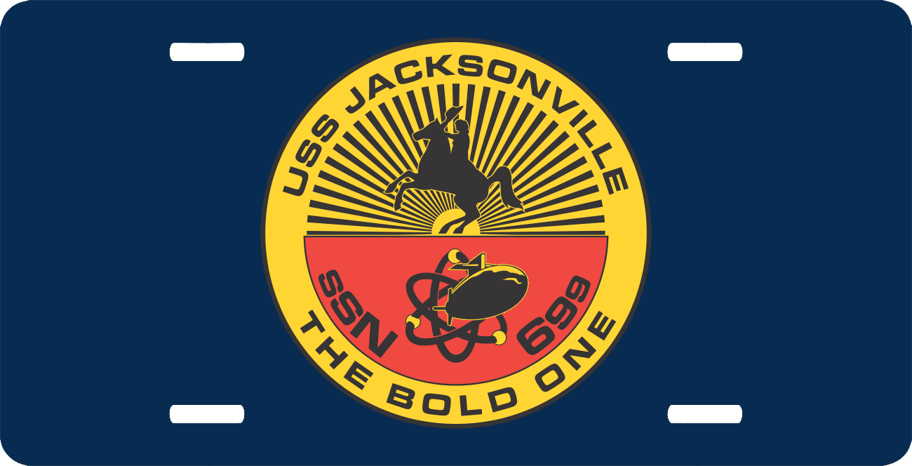 This Navy USS Jacksonville SSN-699 License Plate is made from heavy gauge aluminum and has a baked enamel finish to last for many years of use. Each plate measures 5 15/16" x 11 15/16". This license plate would make a wonderful addition to your collection or a great gift.