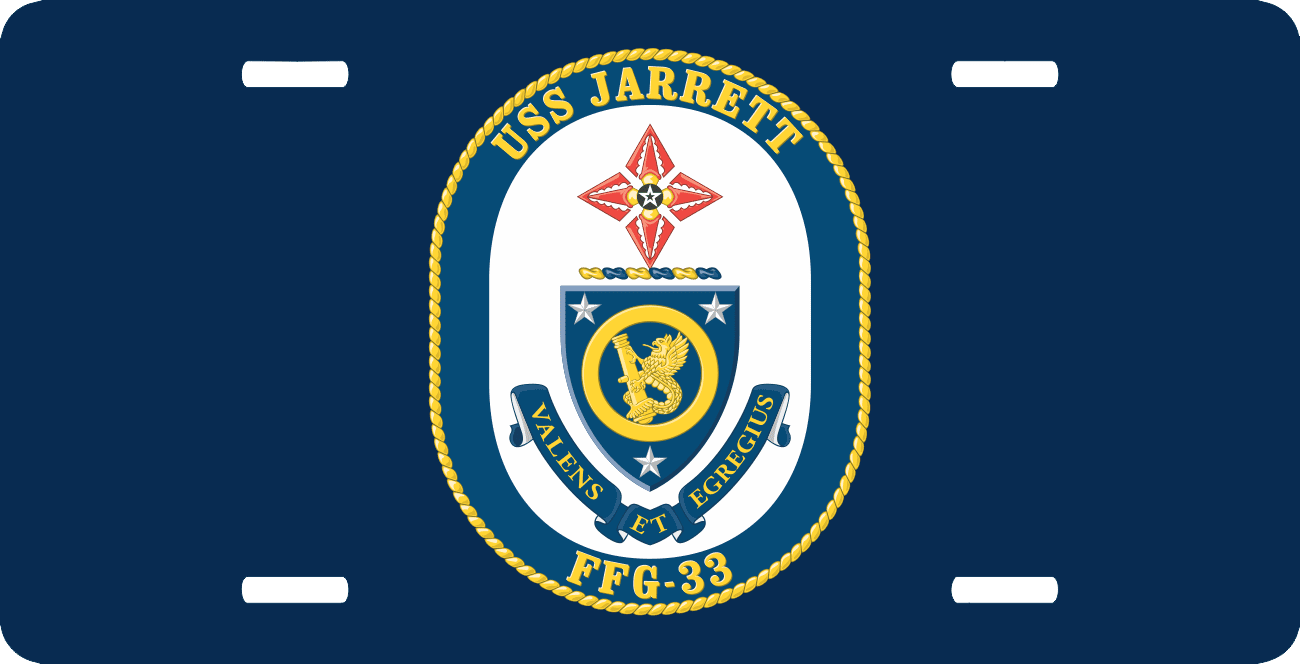 This Navy USS Jarrett FFG-33 License Plate is made from heavy gauge aluminum and has a baked enamel finish to last for many years of use. Each plate measures 5 15/16" x 11 15/16". This license plate would make a wonderful addition to your collection or a great gift.