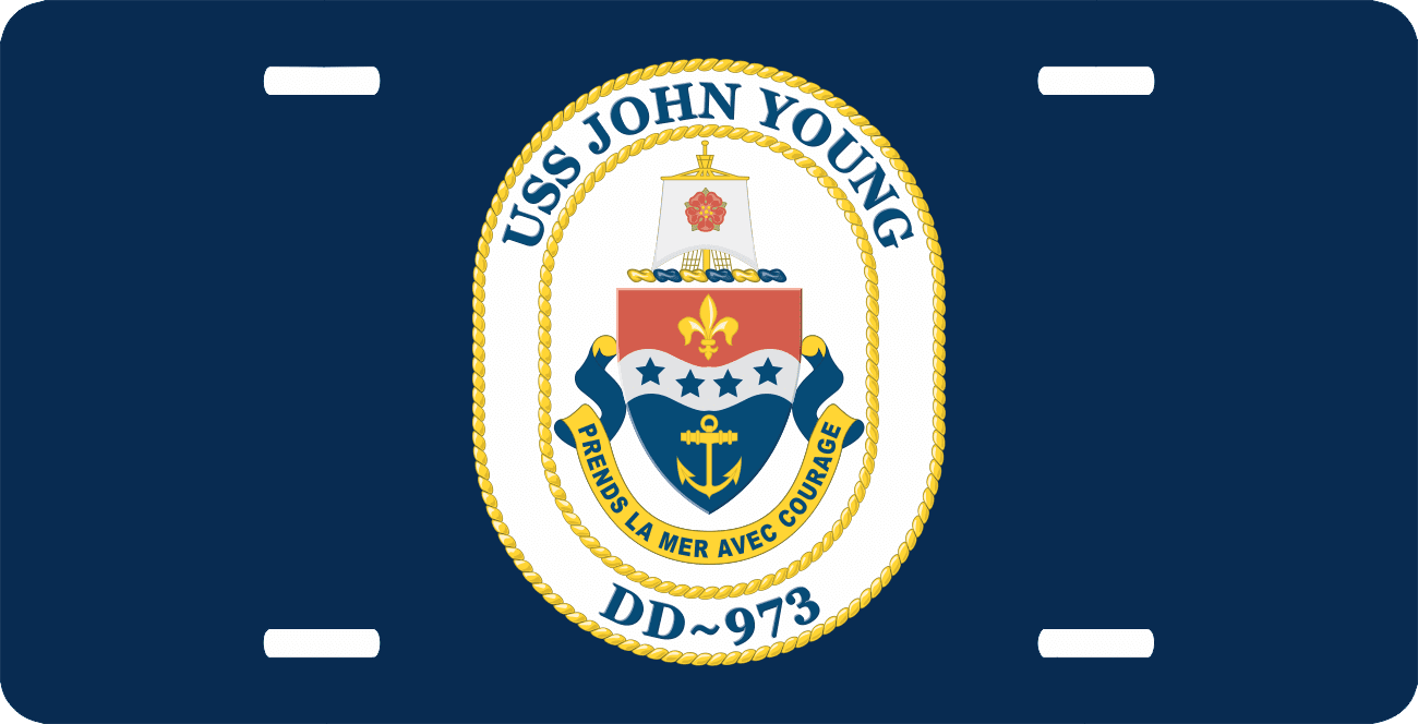 This Navy USS John Young DD-973 License Plate is made from heavy gauge aluminum and has a baked enamel finish to last for many years of use. Each plate measures 5 15/16" x 11 15/16". This license plate would make a wonderful addition to your collection or a great gift.