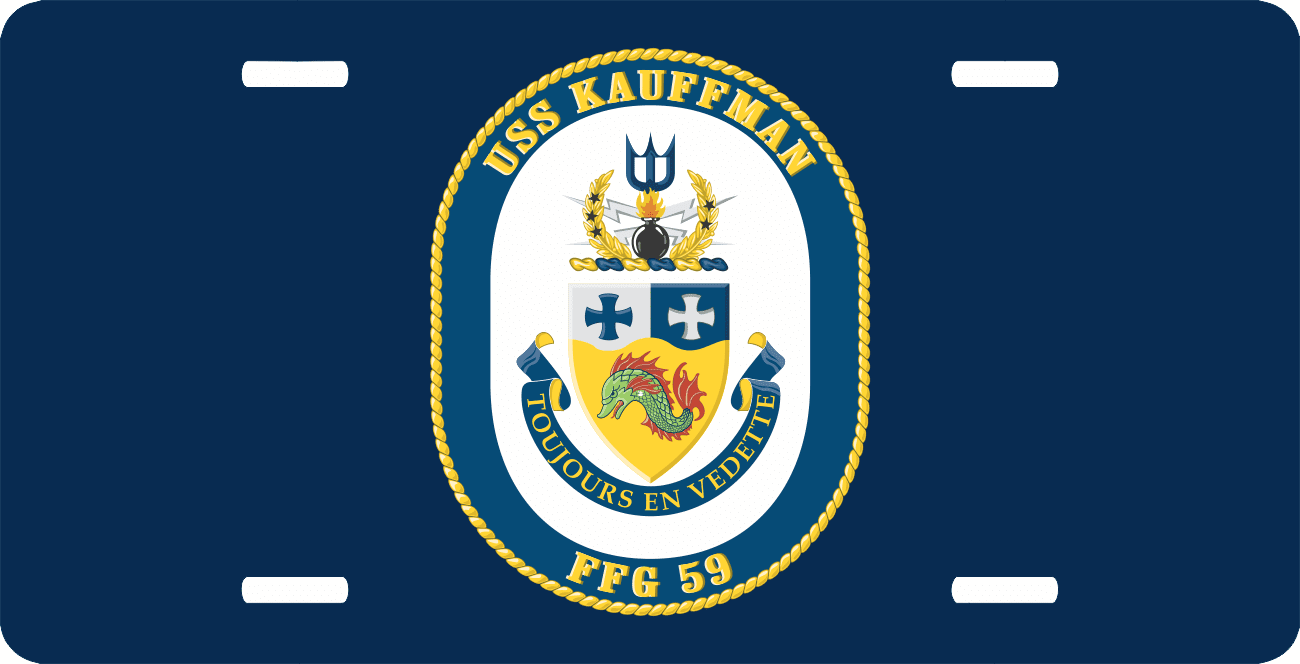 This Navy USS Kauffman FFG-59 License Plate is made from heavy gauge aluminum and has a baked enamel finish to last for many years of use. Each plate measures 5 15/16" x 11 15/16". This license plate would make a wonderful addition to your collection or a great gift.