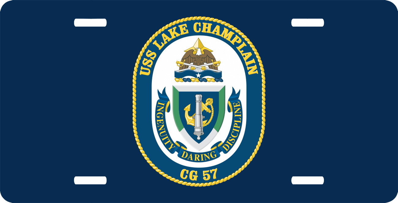 This Navy USS Lake Champlain CG-57 License Plate is made from heavy gauge aluminum and has a baked enamel finish to last for many years of use. Each plate measures 5 15/16" x 11 15/16". This license plate would make a wonderful addition to your collection or a great gift.