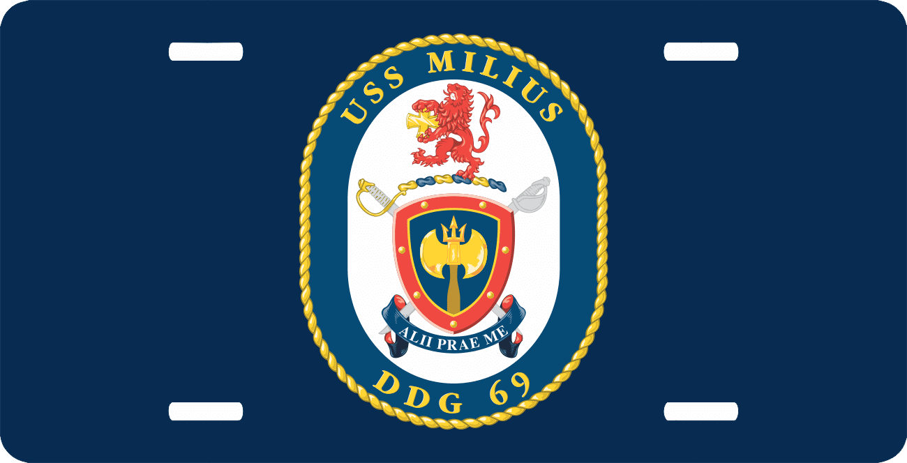 This Navy USS Milius DDG-69 License Plate is made from heavy gauge aluminum and has a baked enamel finish to last for many years of use. Each plate measures 5 15/16" x 11 15/16". This license plate would make a wonderful addition to your collection or a great gift.