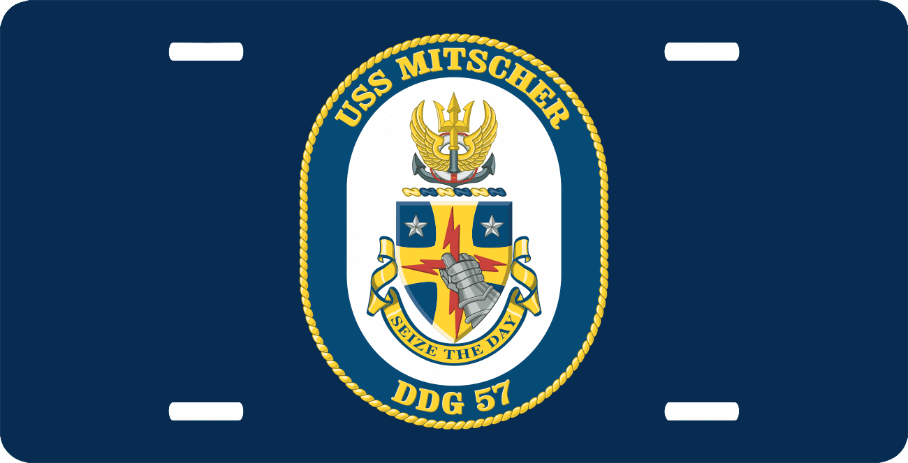 This Navy USS Mitscher DDG-57 License Plate is made from heavy gauge aluminum and has a baked enamel finish to last for many years of use. Each plate measures 5 15/16" x 11 15/16". This license plate would make a wonderful addition to your collection or a great gift.