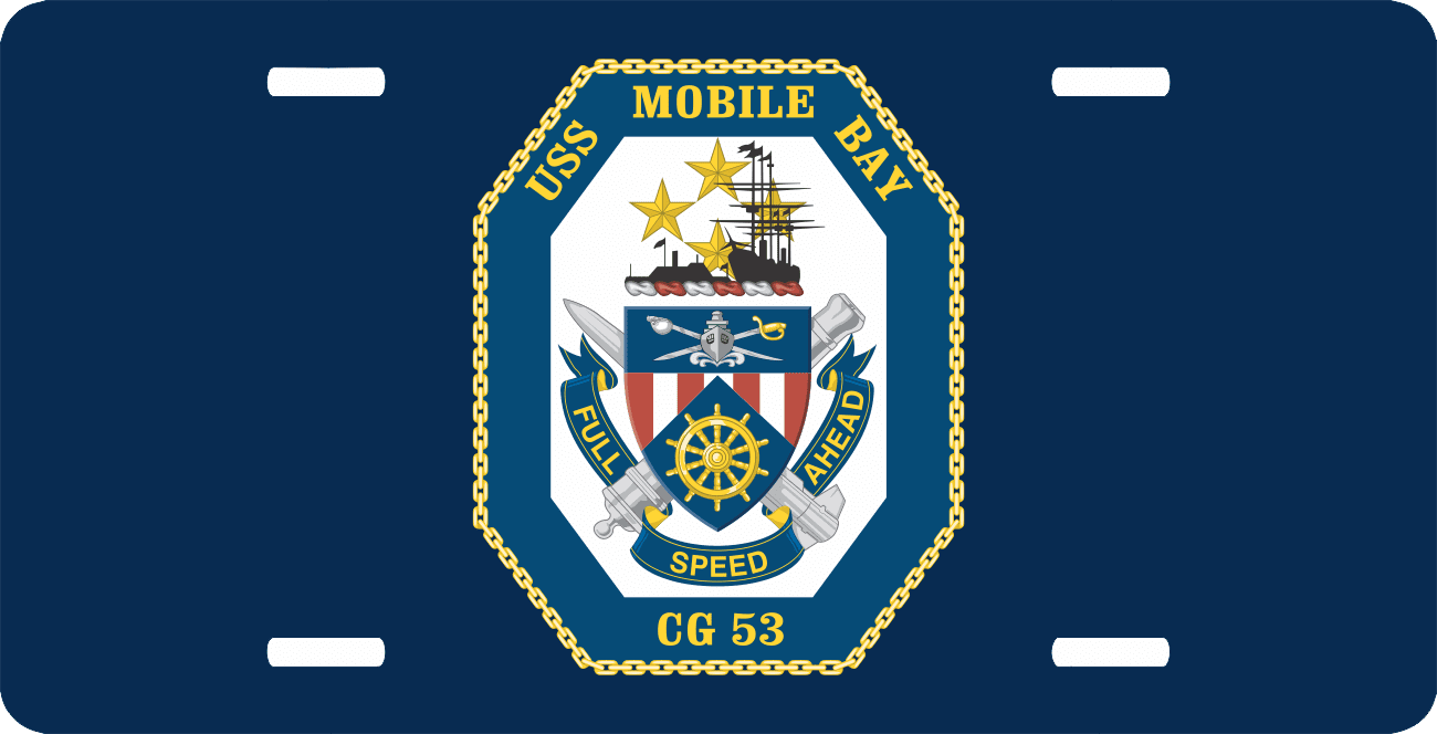 This Navy USS Mobile Bay CG-53 License Plate is made from heavy gauge aluminum and has a baked enamel finish to last for many years of use. Each plate measures 5 15/16" x 11 15/16". This license plate would make a wonderful addition to your collection or a great gift.