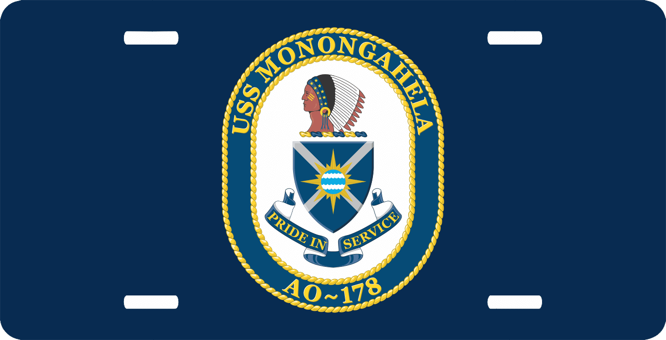 This Navy USS Monongahela AO-178 License Plate is made from heavy gauge aluminum and has a baked enamel finish to last for many years of use. Each plate measures 5 15/16" x 11 15/16". This license plate would make a wonderful addition to your collection or a great gift.