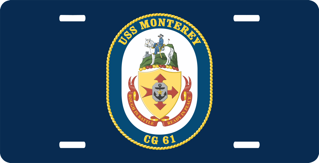 This Navy USS Monterey CG-61 License Plate is made from heavy gauge aluminum and has a baked enamel finish to last for many years of use. Each plate measures 5 15/16" x 11 15/16". This license plate would make a wonderful addition to your collection or a great gift.