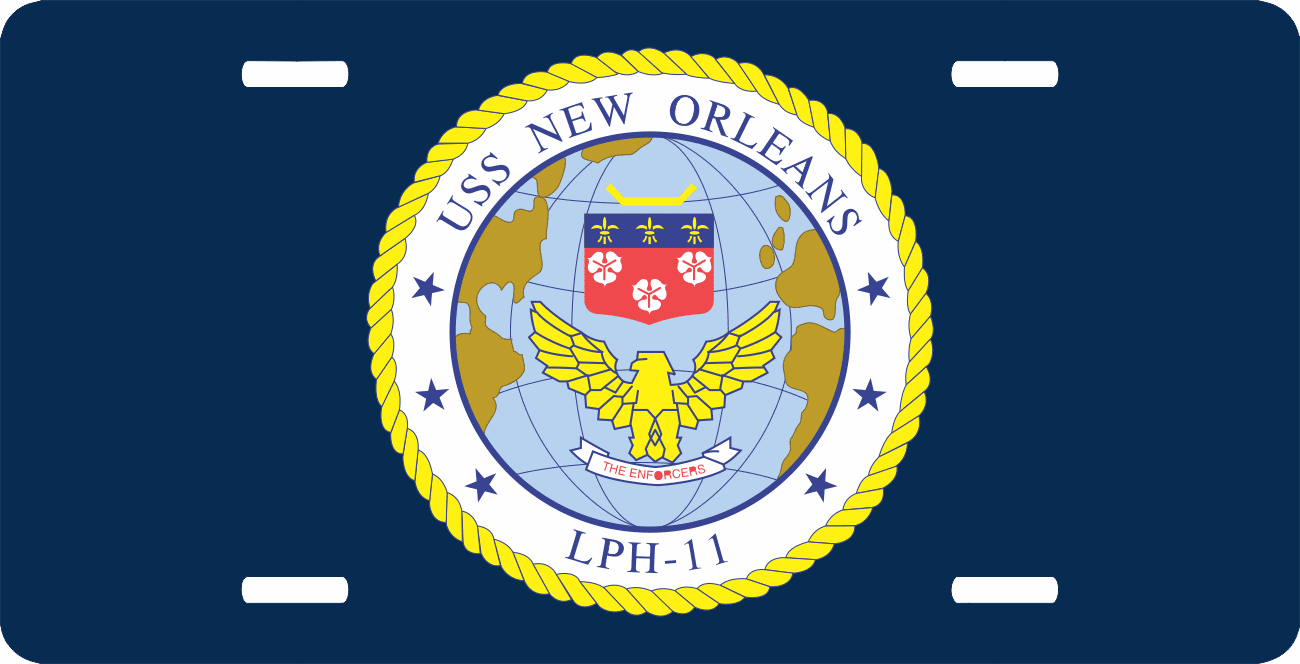 This Navy USS New Orleans LPH11 License Plate is made from heavy gauge aluminum and has a baked enamel finish to last for many years of use. Each plate measures 5 15/16" x 11 15/16". This license plate would make a wonderful addition to your collection or a great gift.