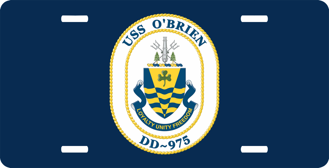 This Navy USS OBrien DD-975 License Plate is made from heavy gauge aluminum and has a baked enamel finish to last for many years of use. Each plate measures 5 15/16" x 11 15/16". This license plate would make a wonderful addition to your collection or a great gift.