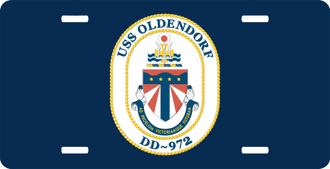 This Navy USS Oldendorf DD-972 License Plate is made from heavy gauge aluminum and has a baked enamel finish to last for many years of use. Each plate measures 5 15/16" x 11 15/16". This license plate would make a wonderful addition to your collection or a great gift.