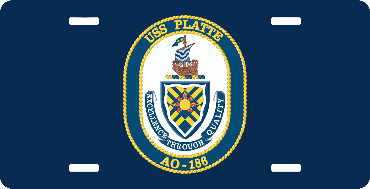 This Navy USS Platte AO-186 License Plate is made from heavy gauge aluminum and has a baked enamel finish to last for many years of use. Each plate measures 5 15/16" x 11 15/16". This license plate would make a wonderful addition to your collection or a great gift.