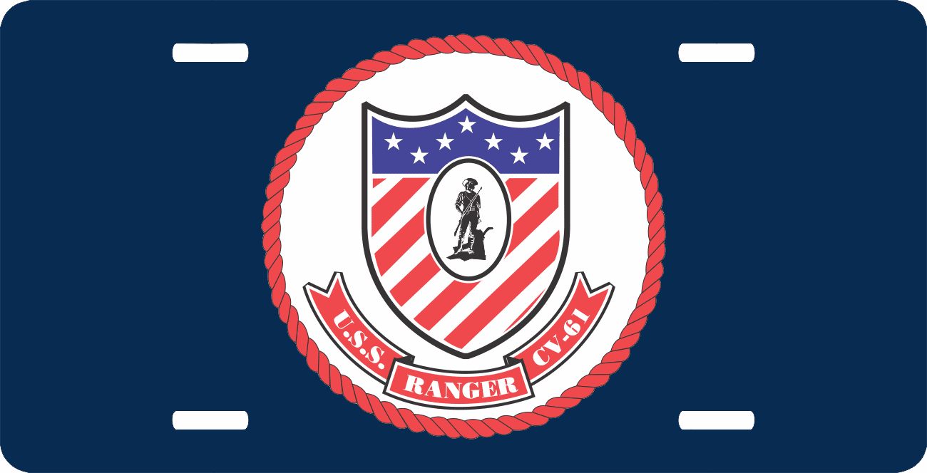 This Navy USS Ranger CV-61 License Plate is made from heavy gauge aluminum and has a baked enamel finish to last for many years of use. Each plate measures 5 15/16" x 11 15/16". This license plate would make a wonderful addition to your collection or a great gift.