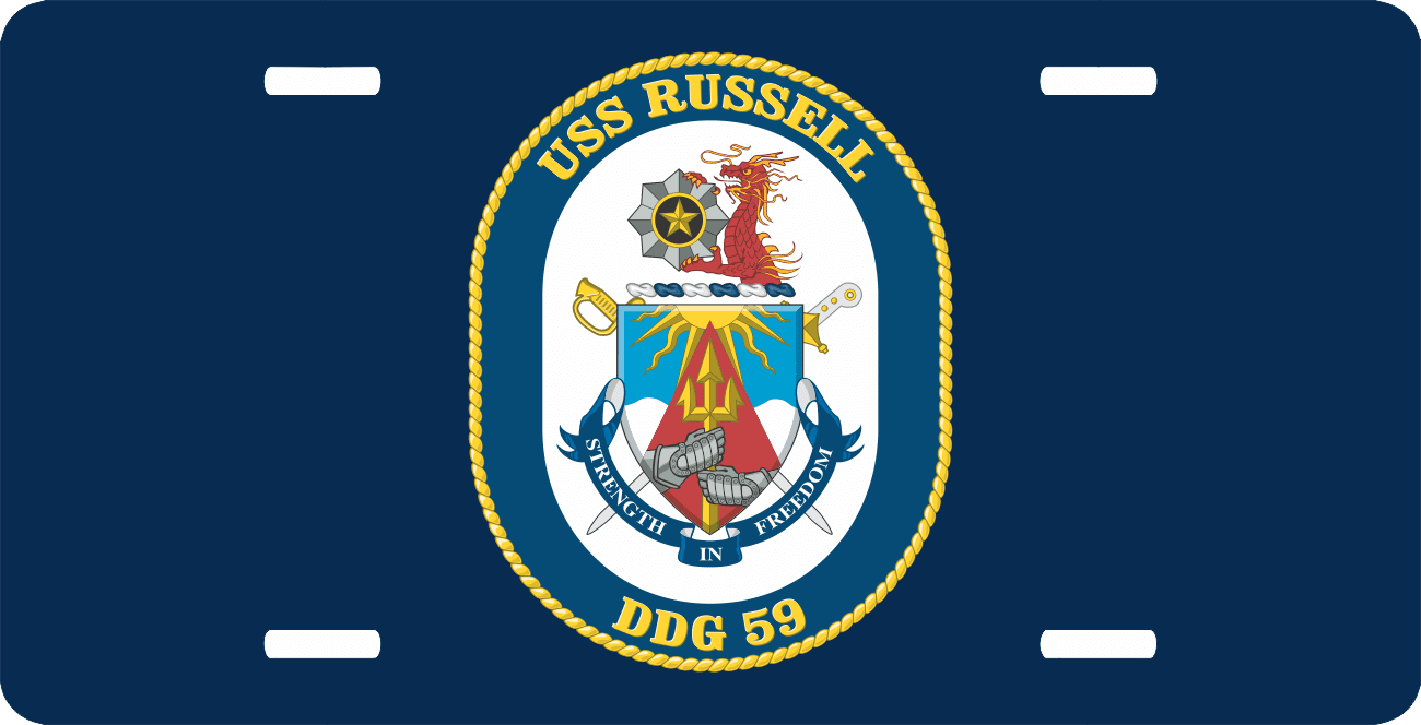 This Navy USS Russell DDG-59 License Plate is made from heavy gauge aluminum and has a baked enamel finish to last for many years of use. Each plate measures 5 15/16" x 11 15/16". This license plate would make a wonderful addition to your collection or a great gift.