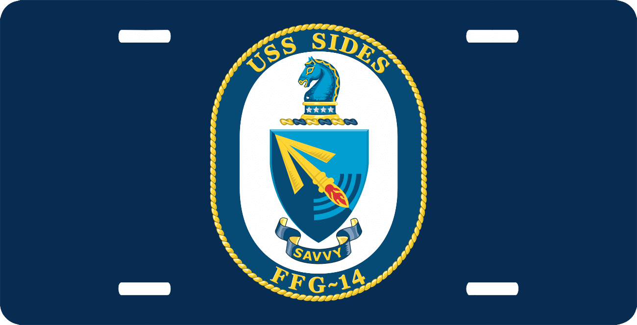 This Navy USS Sides FFG-14 License Plate is made from heavy gauge aluminum and has a baked enamel finish to last for many years of use. Each plate measures 5 15/16" x 11 15/16". This license plate would make a wonderful addition to your collection or a great gift.