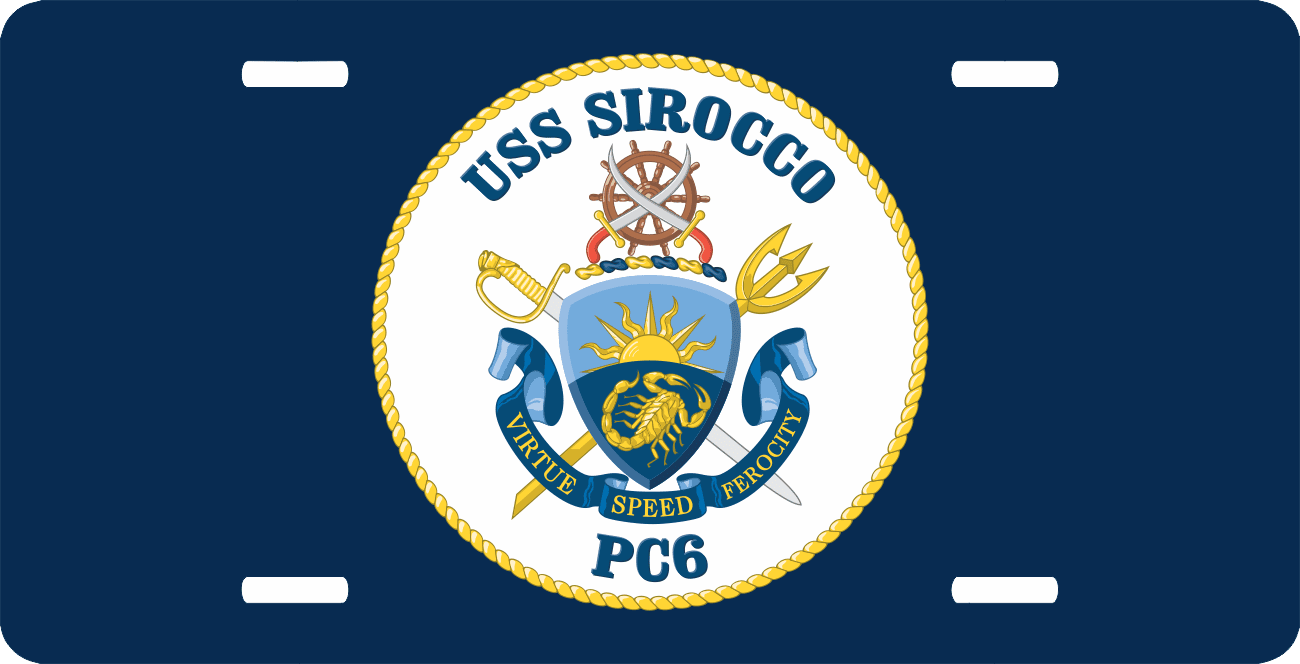 This Navy USS Sirocco PC-6 License Plate is made from heavy gauge aluminum and has a baked enamel finish to last for many years of use. Each plate measures 5 15/16" x 11 15/16". This license plate would make a wonderful addition to your collection or a great gift.