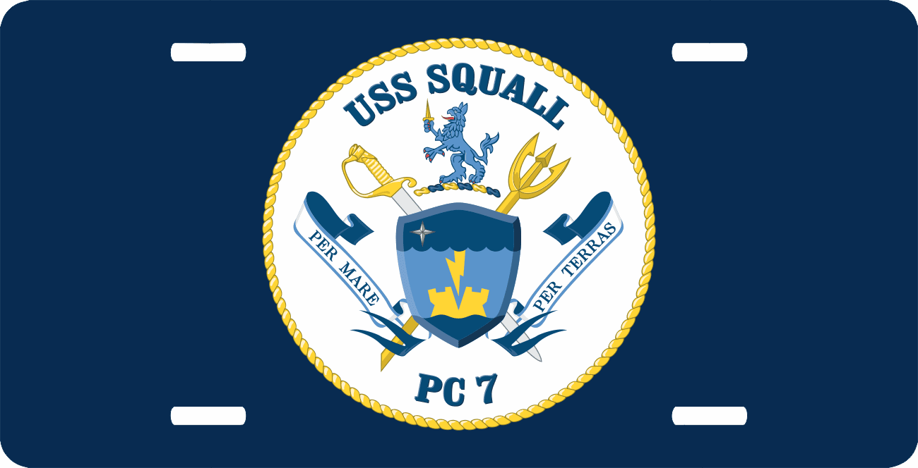 This Navy USS Squall PC-7 License Plate is made from heavy gauge aluminum and has a baked enamel finish to last for many years of use. Each plate measures 5 15/16" x 11 15/16". This license plate would make a wonderful addition to your collection or a great gift.