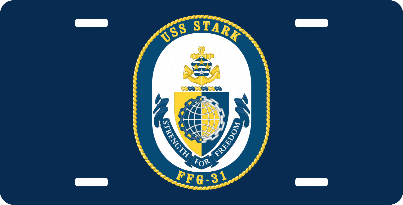This Navy USS Stark FFG-31 License Plate is made from heavy gauge aluminum and has a baked enamel finish to last for many years of use. Each plate measures 5 15/16" x 11 15/16". This license plate would make a wonderful addition to your collection or a great gift.