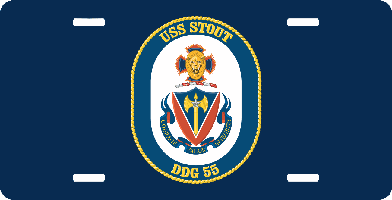This Navy USS Stout DDG-55 License Plate is made from heavy gauge aluminum and has a baked enamel finish to last for many years of use. Each plate measures 5 15/16" x 11 15/16". This license plate would make a wonderful addition to your collection or a great gift.