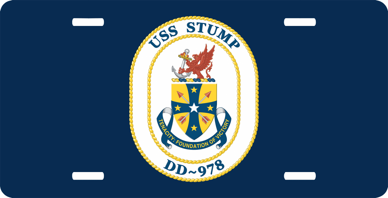 This Navy USS Stump DD-978 License Plate is made from heavy gauge aluminum and has a baked enamel finish to last for many years of use. Each plate measures 5 15/16" x 11 15/16". This license plate would make a wonderful addition to your collection or a great gift.